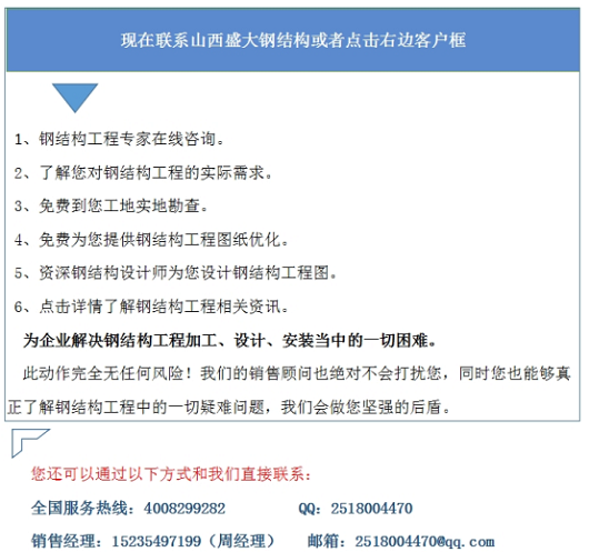 由于國家的大力推廣,在太原鋼結構建筑越來越多,成為了山西省建筑行業的首選。鋼結構是由眾多的大小鋼構件焊接組裝而成。構件的種類有很多,比如大型的有:H型鋼、箱型柱、十字柱、圓柱、等,小型的構件有C型鋼、Z型鋼、方鋼、槽鋼、角鋼、桿件、拉條、錨栓等。