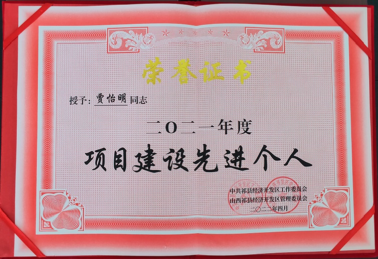 公司董事長(zhǎng)賈怡明同志,在2021年開發(fā)區(qū)項(xiàng)目建設(shè)先進(jìn)表彰大會(huì)上,被中共祁縣經(jīng)濟(jì)開發(fā)區(qū)工作委員會(huì)和山西祁縣經(jīng)濟(jì)開發(fā)區(qū)管理委員會(huì)共同授予“二〇二一年度項(xiàng)目建設(shè)先進(jìn)個(gè)人”榮譽(yù)稱號(hào)。
